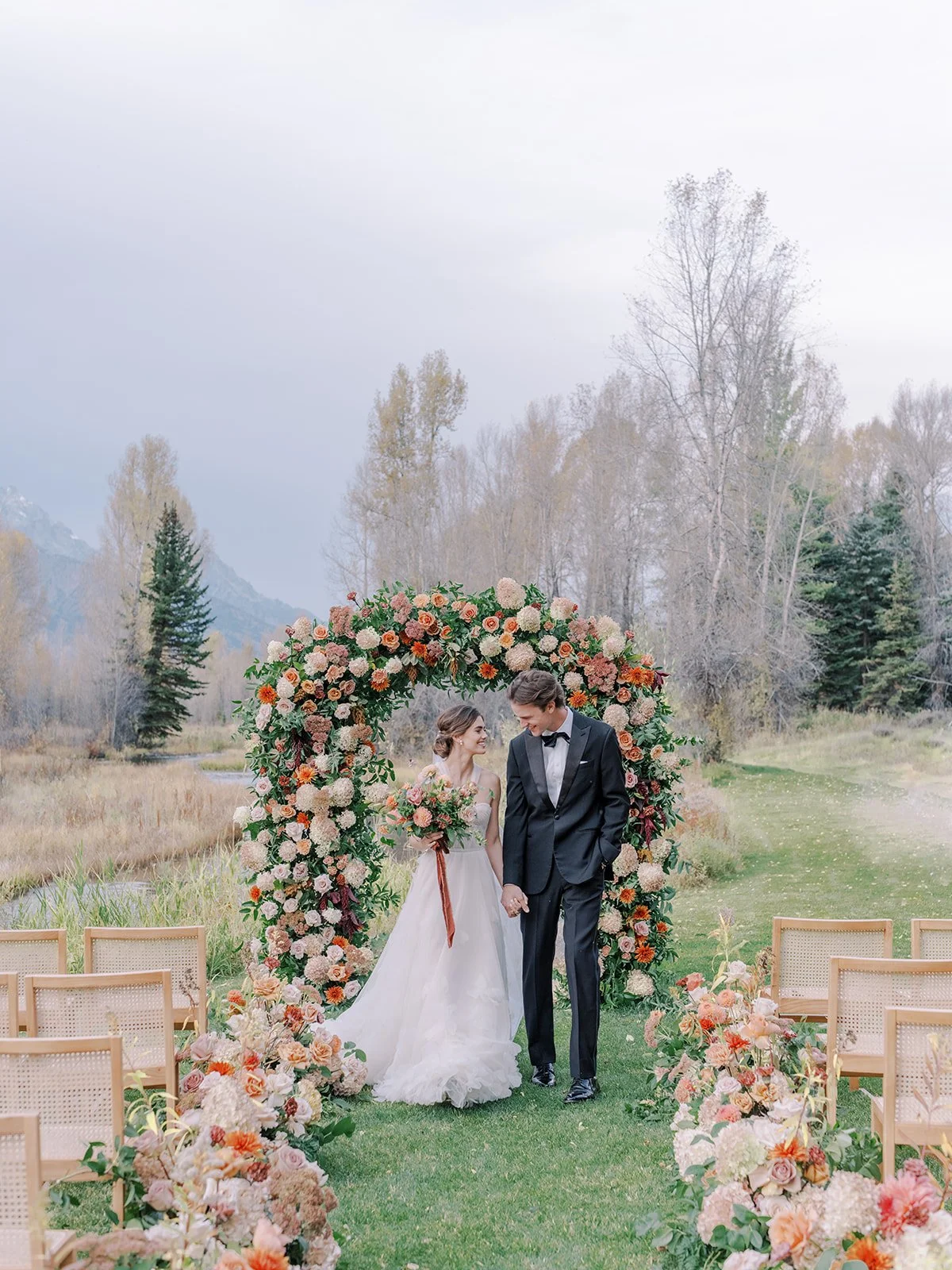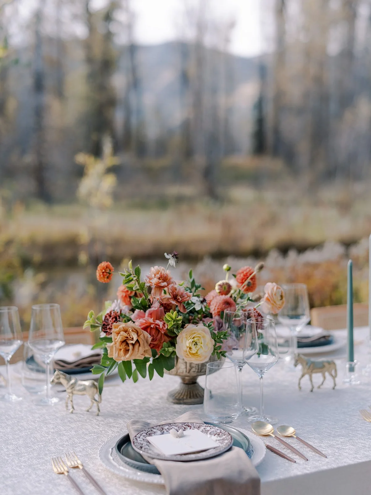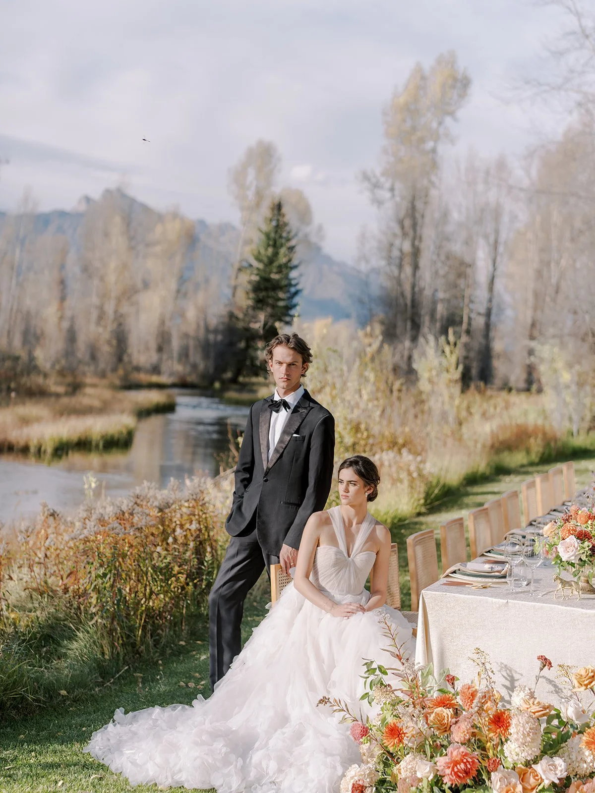 This Antelope Trails Ranch editorial was a study in refined contrast, blending Ralph Lauren–inspired elegance with the raw beauty of the American West. Lush florals in rich autumn hues framed the ceremony space, while tailored details and thoughtful textures elevated the setting. With the Tetons standing boldly in the distance, the shoot celebrated timeless luxury, intentional design, and the artistry of an extraordinary vendor team working in harmony.