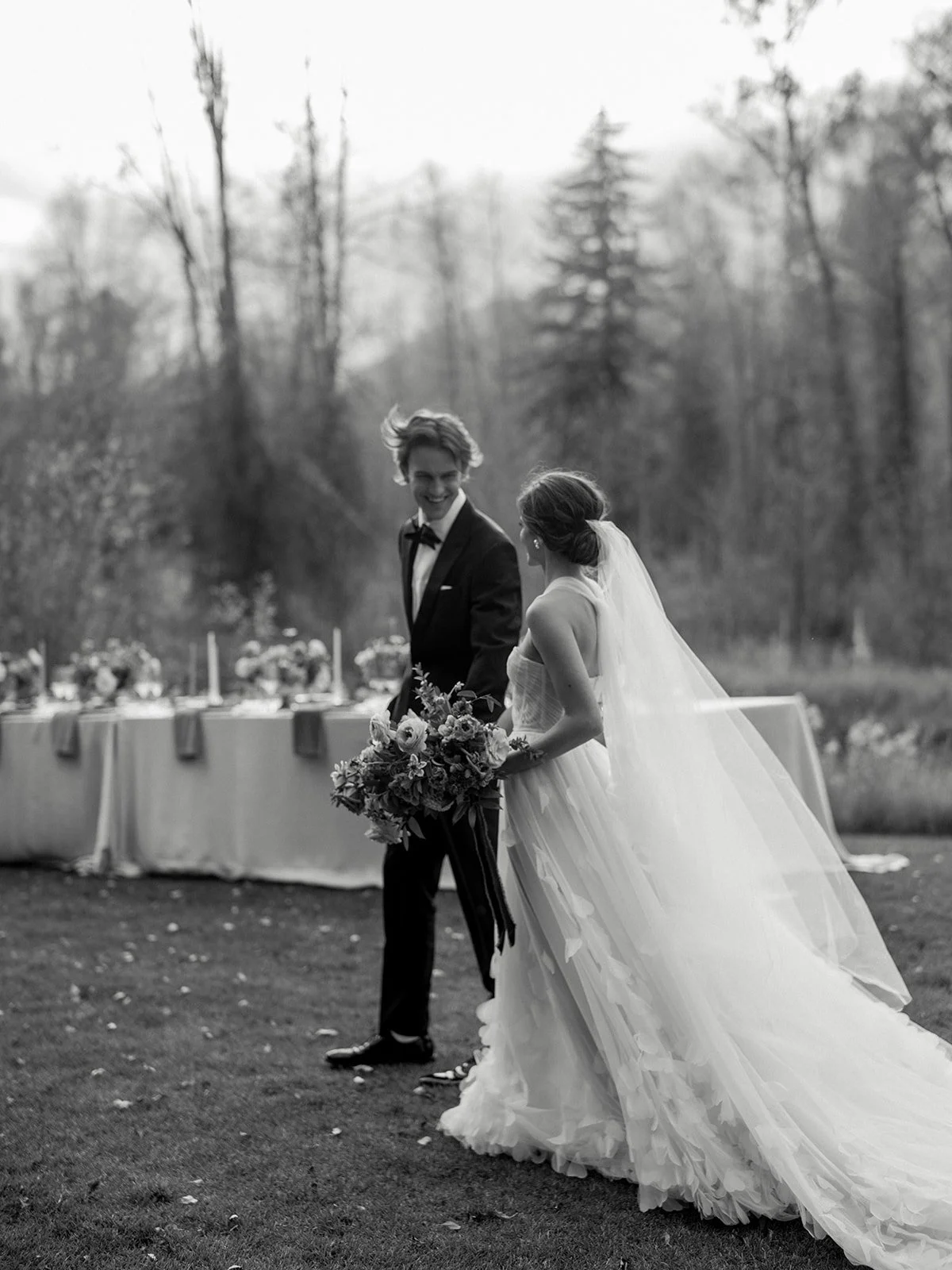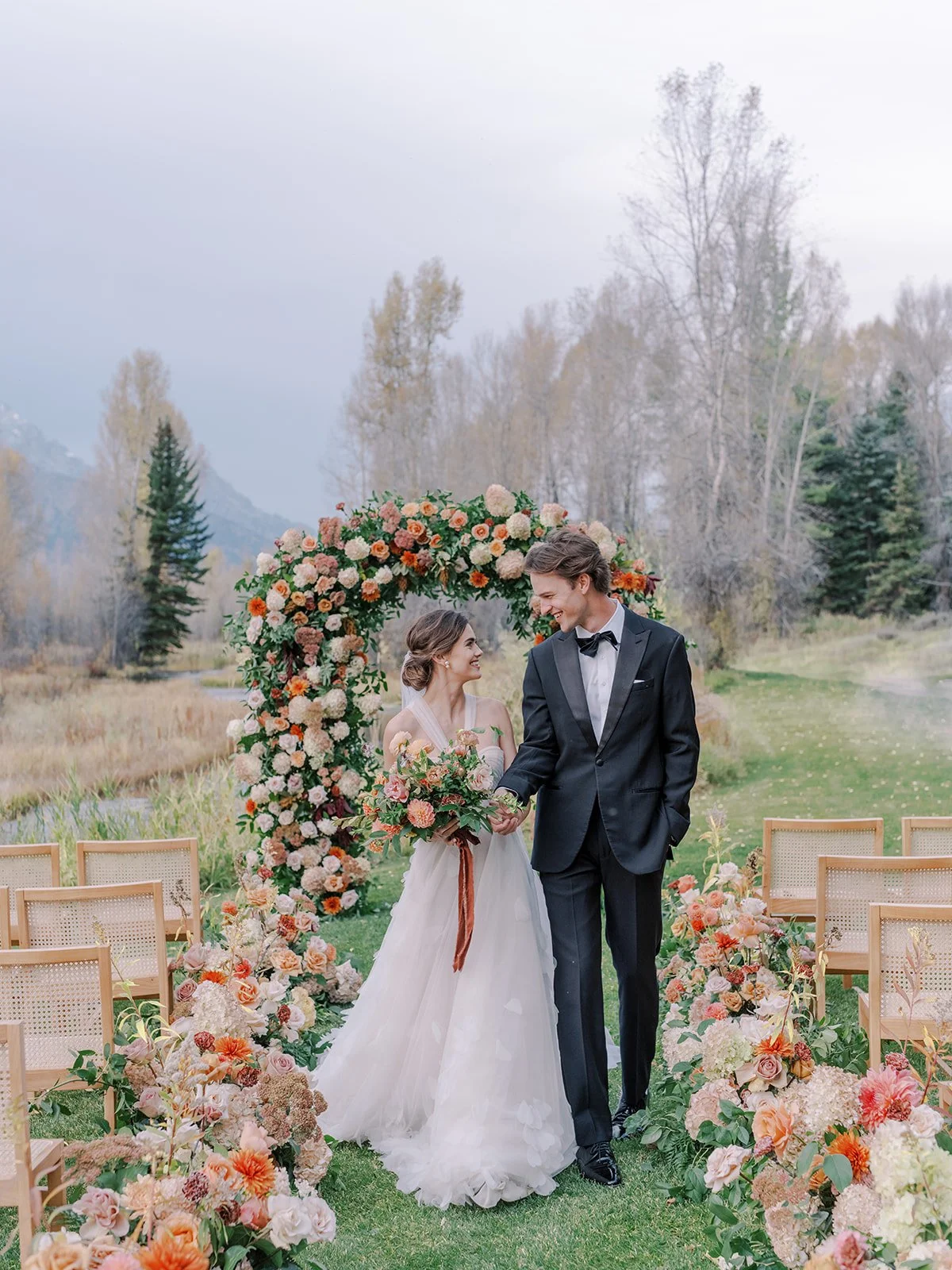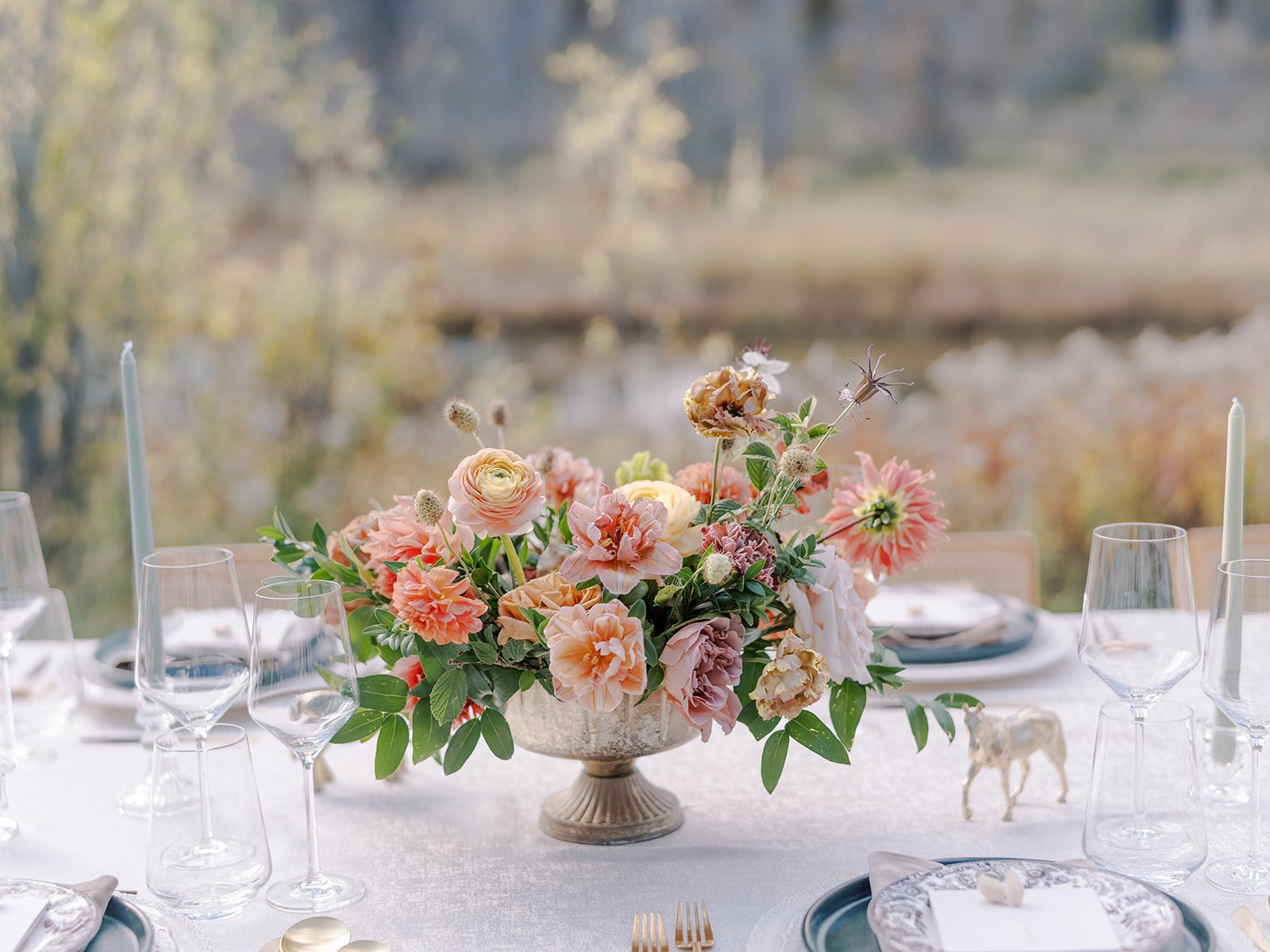 This Antelope Trails Ranch editorial was a study in refined contrast, blending Ralph Lauren–inspired elegance with the raw beauty of the American West. Lush florals in rich autumn hues framed the ceremony space, while tailored details and thoughtful textures elevated the setting. With the Tetons standing boldly in the distance, the shoot celebrated timeless luxury, intentional design, and the artistry of an extraordinary vendor team working in harmony.